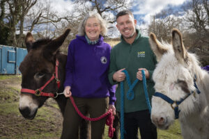 LockStock and Snowdonia Donkeys; Pictured at Snowdonia Donkeys is Ruth Stronge with Lock Stock Self Storage Area Manager Lee Hanson and donkeys Walter and Norman. Picture Mandy Jones